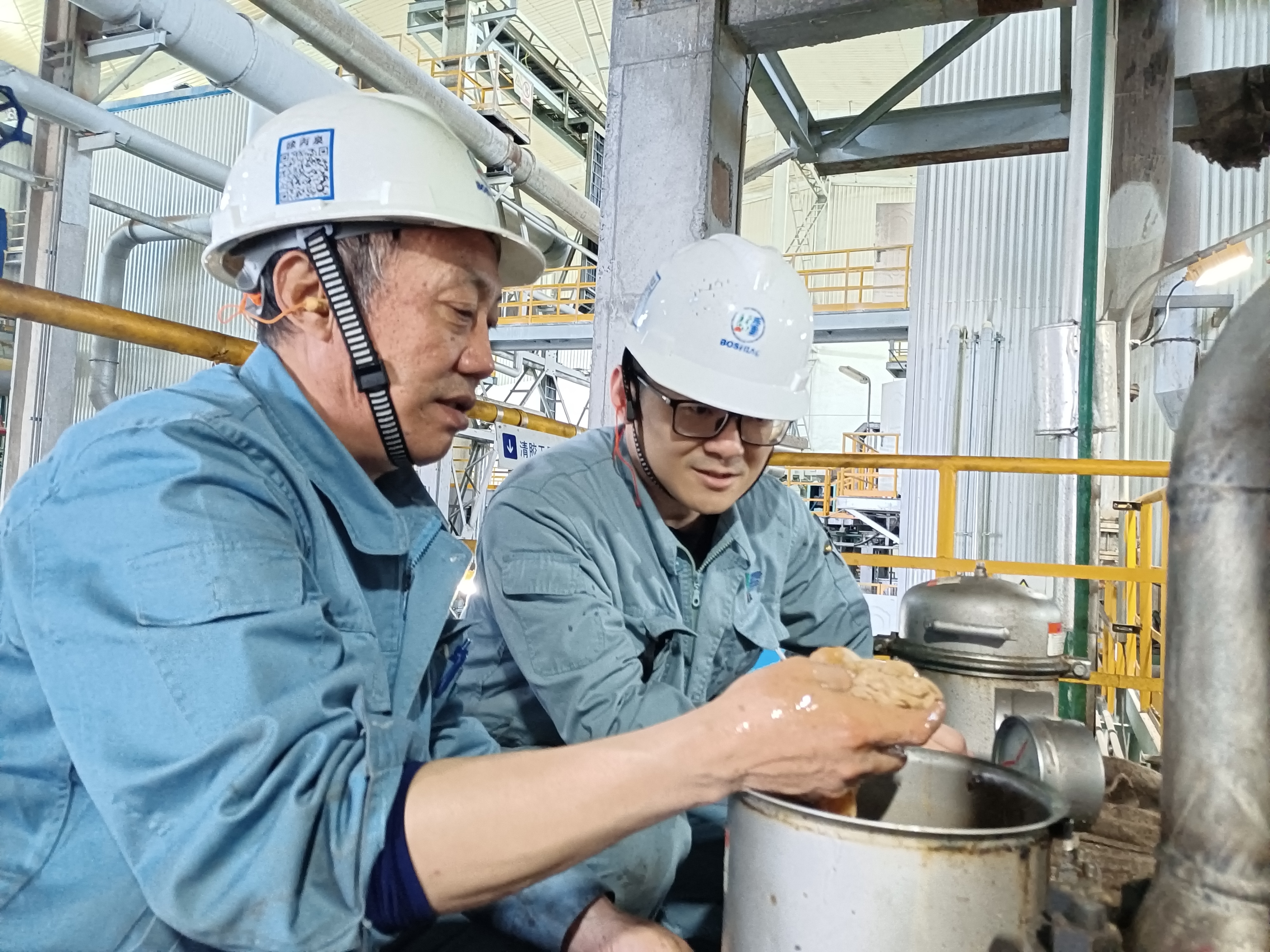 干燥機拆模板要伴隨著幾十度的高溫,不僅付出體力,還考驗操作技能。老師傅們是拆模板的主力,他們有著豐富的經驗和過硬的技術,這是他們十多年來在工作中學習與摸索出來的。他們擰著一個個螺栓,汗水一滴滴流下來,一邊熟練地操作著,一邊給新員工講解檢修流程,傾囊相授教導著新員工,時刻也不忘提醒安全。“慢慢干,不要急,安全第一,有什么問題問我們就行。”